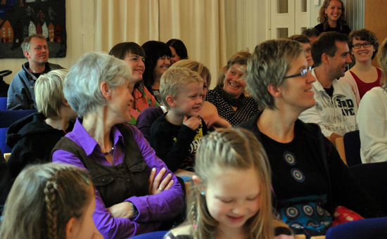 Borna nikkar einig og klappar ivrig då Parr og Mæhle ser seg ferdig med eit svært vellukka barnearrangement under dei Nynorske litteraturdagane dette året.