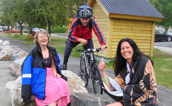 I det dei sit på land og tørkar seg i den fine maisola, kjem Håvard Ragnhildstveit forbi på veg til møte på kommunehuset. Han har sjølvsagt sykla dei 5 kilometrane frå Holdhus til Eikelandsosen. Fusa i farten – svuuusj!