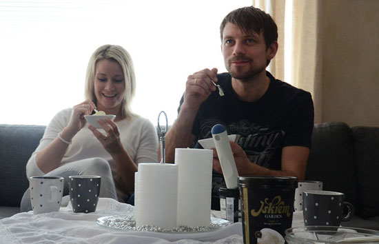 Bondeparet, som er i byrjinga av tredveåra, sit i stova heime på garden. Tre ungar sullar med sitt og det er iskrem på bordet.