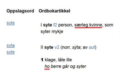 Er det meir kvinneleg å syte, slik Nynorskordboka kan få oss til å tru?