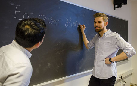 Styremedlem i Studentmållaget i Oslo, Vegard Storsul Opdahl, stiller frivillig opp for å læra usikre studentar substantiv og verbbøying på nynorsk.