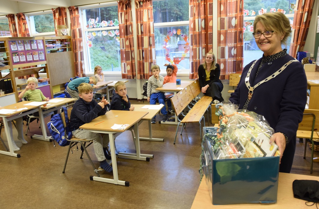Denne veka er ho og ordførar Jorunn Skåden rundt på skulane i kommunen og deler ut bokkassar.
