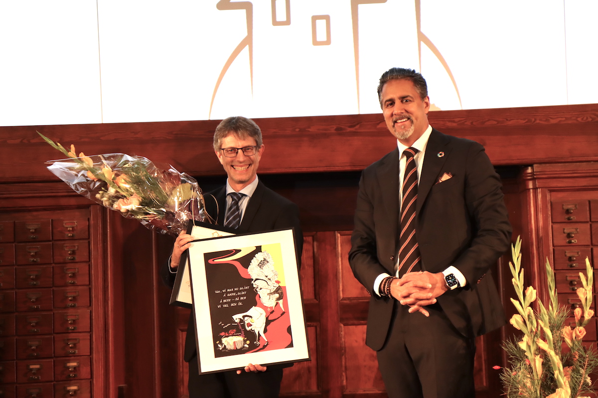 Kulturminister Abid Q. Raja delte ut prisen til Voss herad på Nasjonalbiblioteket i Oslo, fredag 30. oktober klokka 12.30.